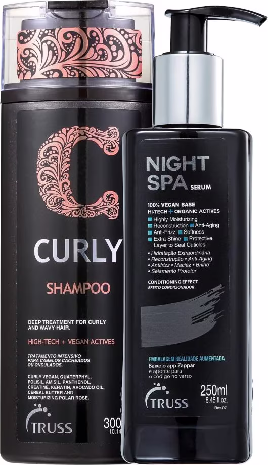 Não sei o CEPO Kit Truss Curly Shampoo 300ml + Night Spa 250ml é um conjunto de produtos de alta qualidade projetado para cuidar e realçar a beleza dos cabelos cacheados e ondulados. Combinando limpeza suave e tratamento intensivo, este kit oferece uma rotina completa para manter seus cachos hidratados, definidos e saudáveis.