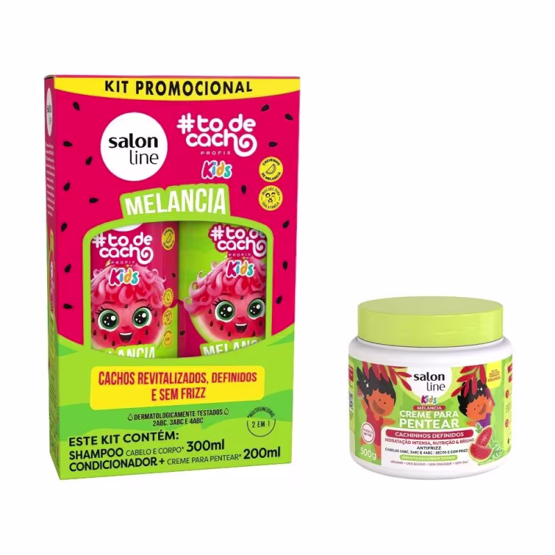 O Kit Conta com 1 Kit Shampoo e Condicionador Melancia Kids, 1 Creme para Pentear Condicionante Melancia Kids. Este kit é ideal para a rotina capilar das crianças, deixando os cabelos macios, perfumados e impecavelmente definidos.