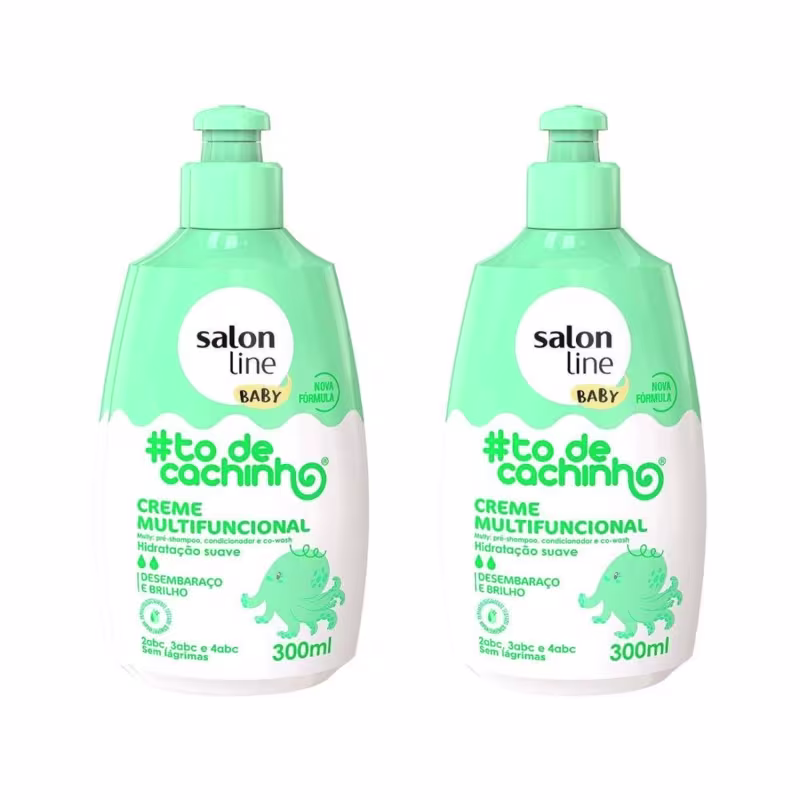 O Kit conta com 2 Cremes Multifuncional #Todecachinho Baby Salon Line 300ml. Auxilia no desembaraço, na hidratação e maciez dos cabelos do bebê. Pode ser usado como pré-shampoo, condicionador e co-wash. É hipoalergênico, testado dermatologicamente e sem lágrimas!