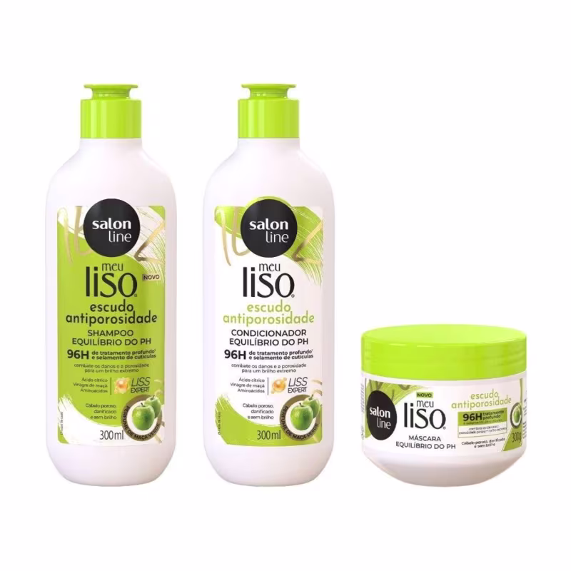O Kit conta com 1 Shampoo, 1 Condicionador e 1 Máscara Escudo Antiporosidade da linha Meu Liso. Que juntos tratam fios porosos, ressecados e sem brilho.