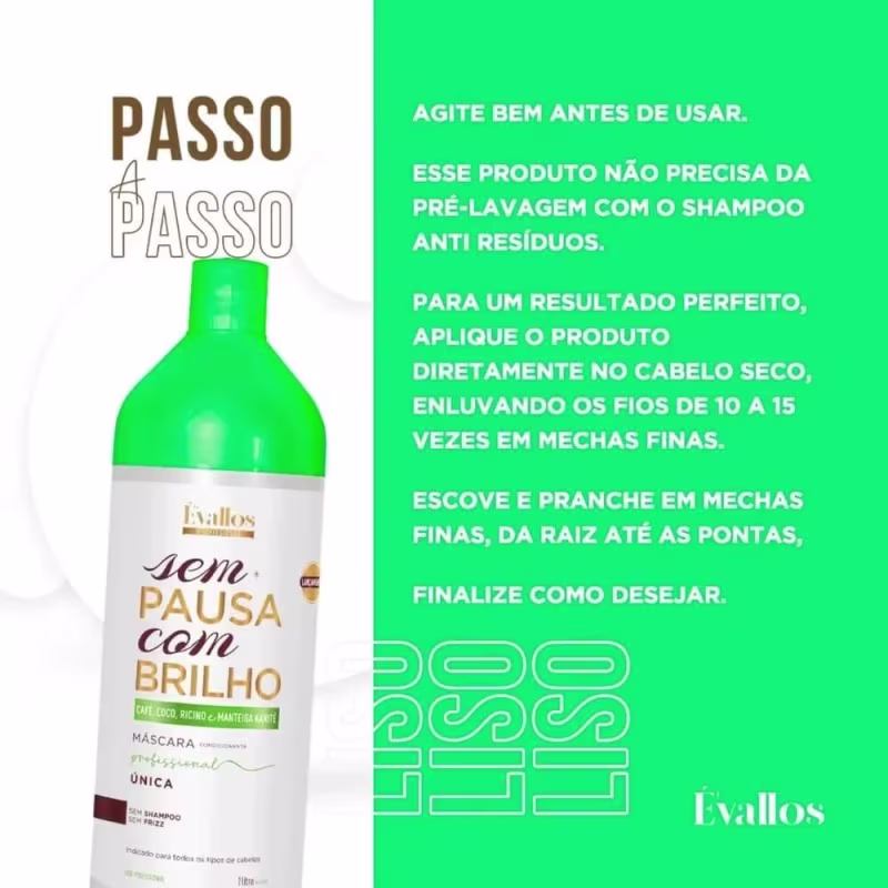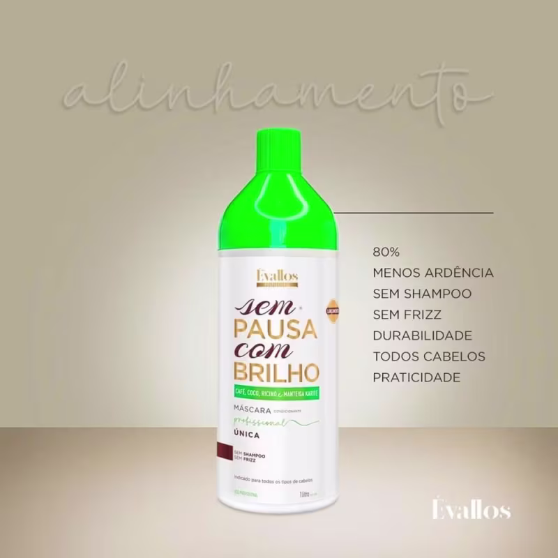 AçãoCom a Evallos Sem Pausa com Brilho você tem praticidade, rapidez nos processos de alisamento e o melhor de tudo não precisa abrir as cutículas. Alinha 100% os fios, sem o uso de Shampoo com 80% menos Ardência.