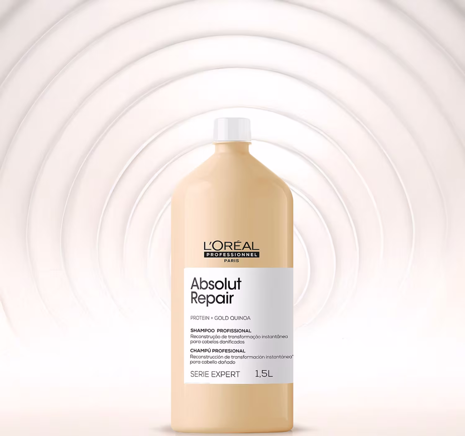 L'Oréal Professionnel Serie Expert Absolut Repair Gold Quinoa Protein - Shampoo 1,5L: reestrutura a fibra capilar, confere brilho e leveza durante a limpeza diária dos fios. Seus ativos que ajudam restaurar a superfície dos fios para que o cabelo revele uma aparência mais saudável.