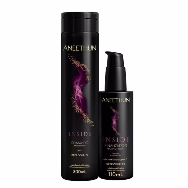 1 Shampoo Aneethun Inside (300ml): Formulado com ingredientes poderosos que limpam delicadamente os cabelos, removendo impurezas sem ressecar. Sua fórmula exclusiva ajuda a fortalecer a fibra capilar desde a raiz, preparando os fios para receber os benefícios do finalizador.