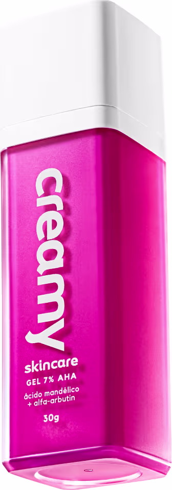 O Creamy Skincare Gel 7% AHA Ácido Mandélico + alfa-arbutim é o primeiro produto com efeito peeling noturno suave de uso diário.