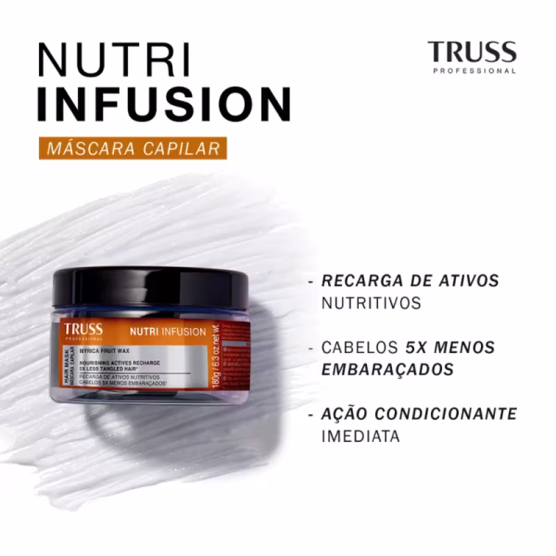 O combo Nutri Infusion Truss é ideal para quem busca uma rotina de cuidados completa para cabelos ressecados e fragilizados. Com ele, você terá cabelos limpos, hidratados, nutridos, com brilho intenso e livre do frizz, devolvendo a saúde e o vigor dos seus fios.