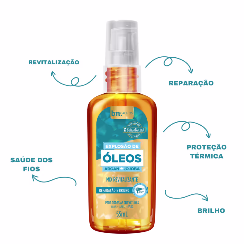 O Explosão de Óleos Argan + JoJoba é ideal para cabelos crespos, cacheados e ondulados. Revitaliza e repara os fios sem pesar, trazendo brilho e saúde para os cabelos. Possui proteção térmica e uma combinação de aromas que deixas os cabelos super perfumados.