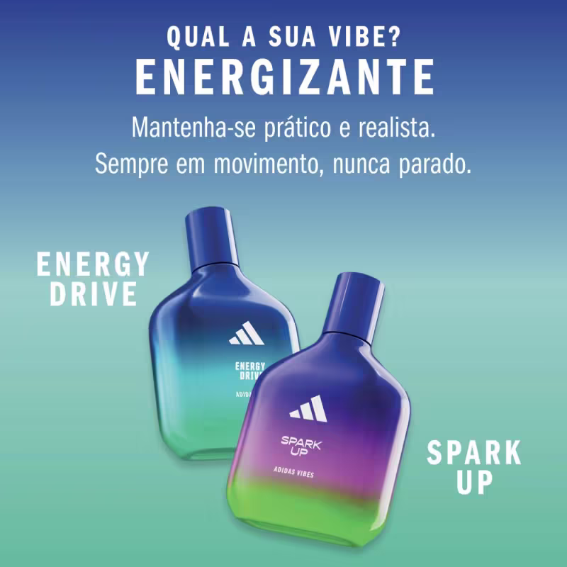 Não sei o CEPO perfume Adidas Vibes Energy Drive Eau de Parfum 30ml é uma fragrância cítrica aromática de longa duração. Conta com notas poderosas e energizantes de cardamomo e pimenta rosa, que proporcionam uma explosão de energia imparável, como se nada pudesse te atrapalhar. 75% dos consumidores dizem que o perfume Vibes Energy Drive aumenta a energia*. Além disso, conta com fórmula vegana, embalagem feita com materiais reciclados e dermatologicamente testado. Sente a vibe com as novas fragrâncias Adidas Vibes e conheça a coleção completa. 6 fragrâncias para todos. *Resultados obtidos a partir de testes com 106 participantes.
