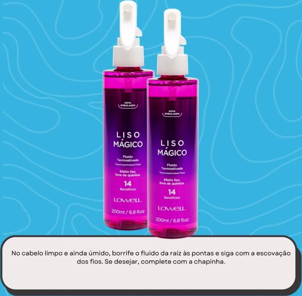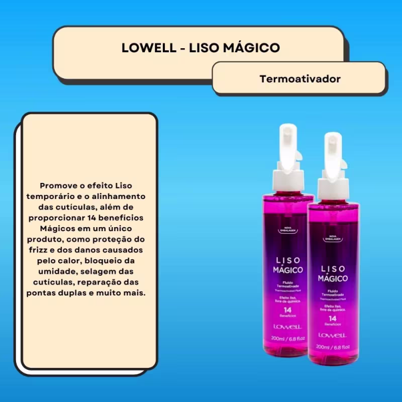 Não sei o CEPFluído termoativado para todos os tipos de cabelo. Lowell Keeping Liss Liso Mágico promove efeito liso sem frizz com maciez e brilho intensos.