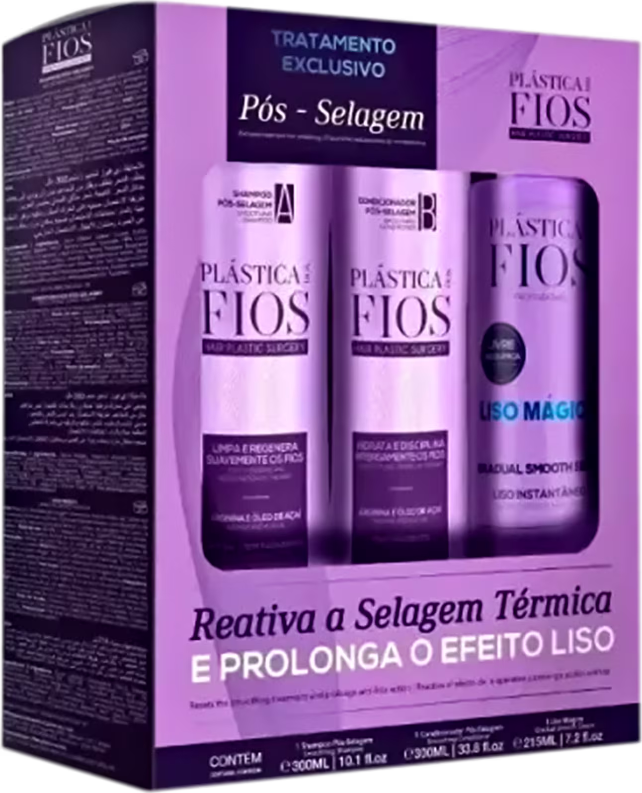 Com Óleo de Açaí e Arginina. Possui PH ácido. Hidrata intensamente e disciplina os fios, prolongando o efeito liso. O shampoo Pós Selagem Térmica limpa suavemente reduzindo o frizz sem provocar o ressecamento dos fios. Enquanto que o condicionador Pós Selagem Térmica promove hidratação profunda e disciplina dos fios.