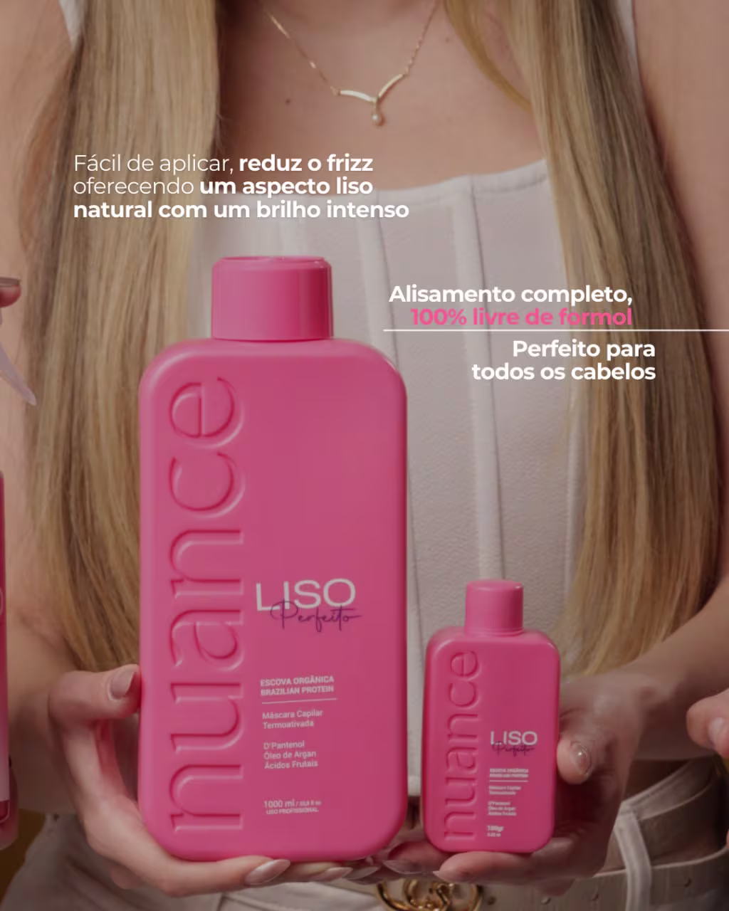 A Liso Perfeito é um tratamento que transforma cabelos ondulados, cacheados, crespos e indisciplinados, tornando-os perfeitamente lisos, com volume reduzido, fibra capilar alinhada, livre de frizz e muito brilho. Ela promove uma selagem térmica sem formol. A Liso Perfeito para realinhamento térmico tem textura em creme, leve suave e de rápida absorção, não arde, não tem cheiro forte e nem causa incomodo.