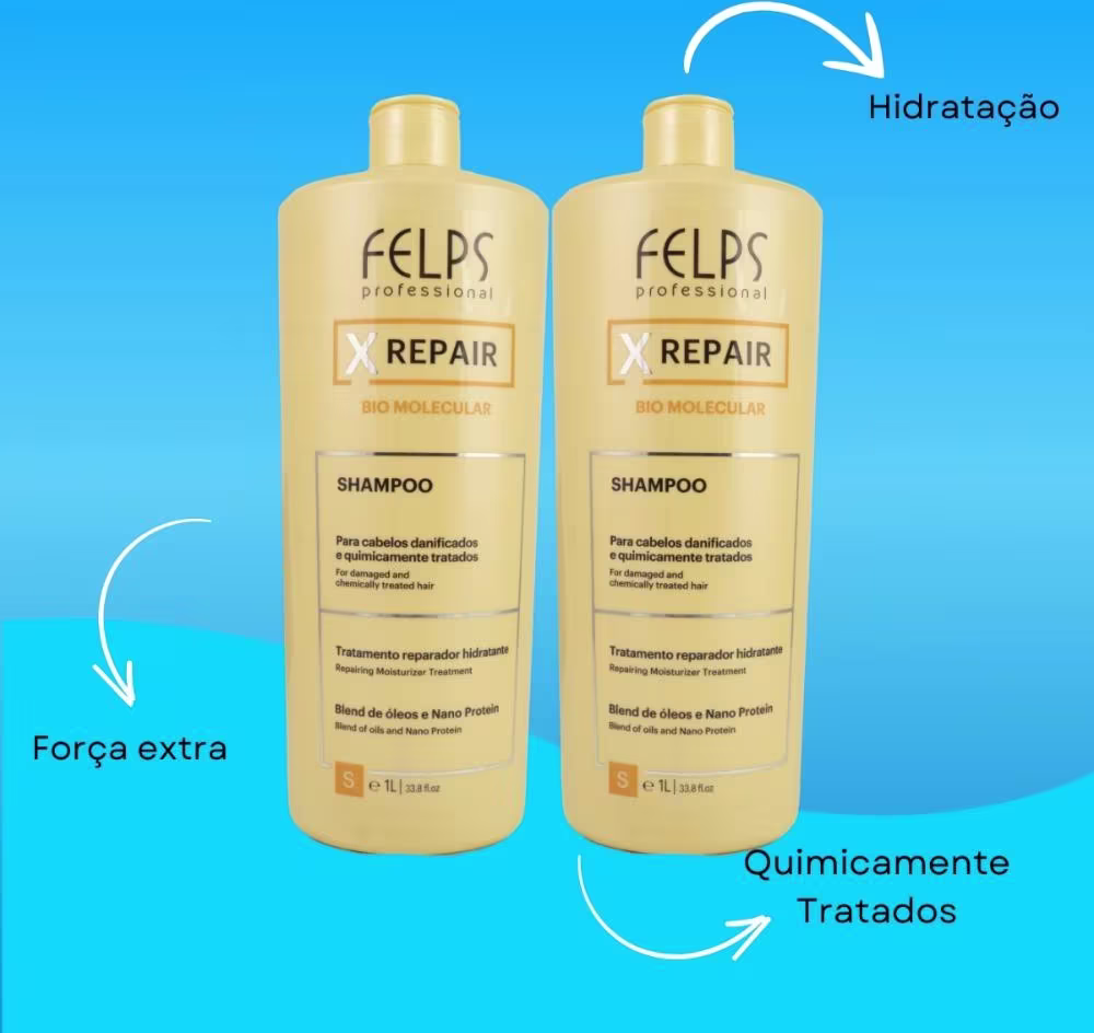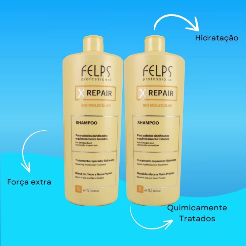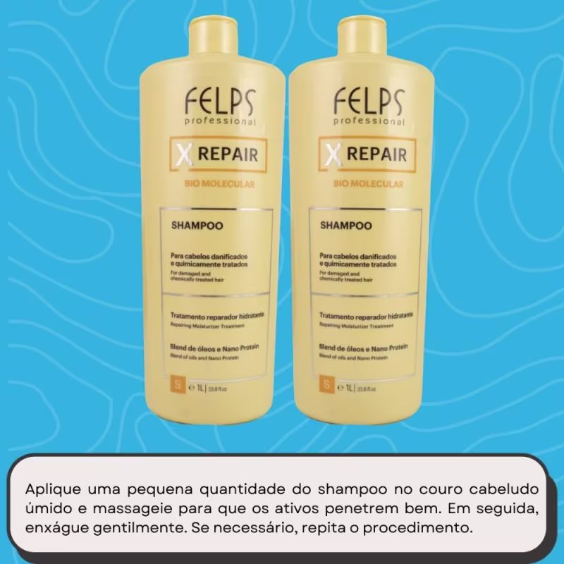 Contém:02 Unidades Felps X Repair Bio Molecular Shampoo 1L