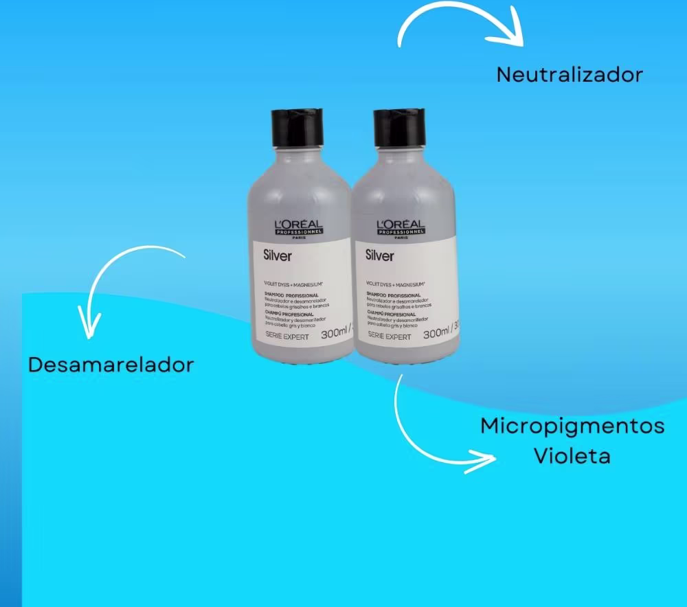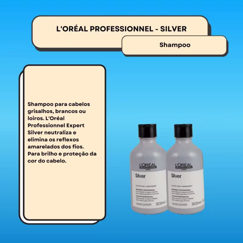 O Shampoo L'Oréal Professionnel Silver tem o poder de neutralizar e eliminar os reflexos amarelados indesejáveis nos cabelos grisalhos, brancos ou loiros.