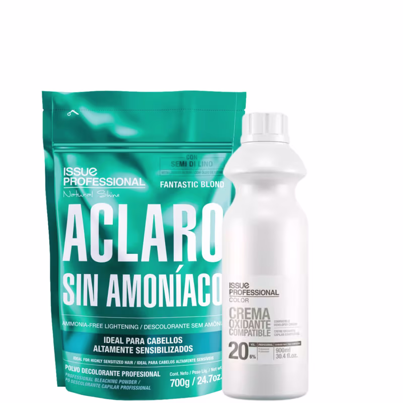 O Kit Issue Descolorante Sem Amônia + Água Oxigenada 20 Volumes 900ml foi desenvolvido para garantir um clareamento eficiente com menor agressão aos fios. Indicado para cabelos sensibilizados ou para quem busca um processo de descoloração mais suave, o pó descolorante sem amônia preserva a estrutura capilar, enquanto a emulsão oxidante de 20 volumes proporciona um clareamento moderado, ideal para mechas, luzes ou preparação para tonalizações.
