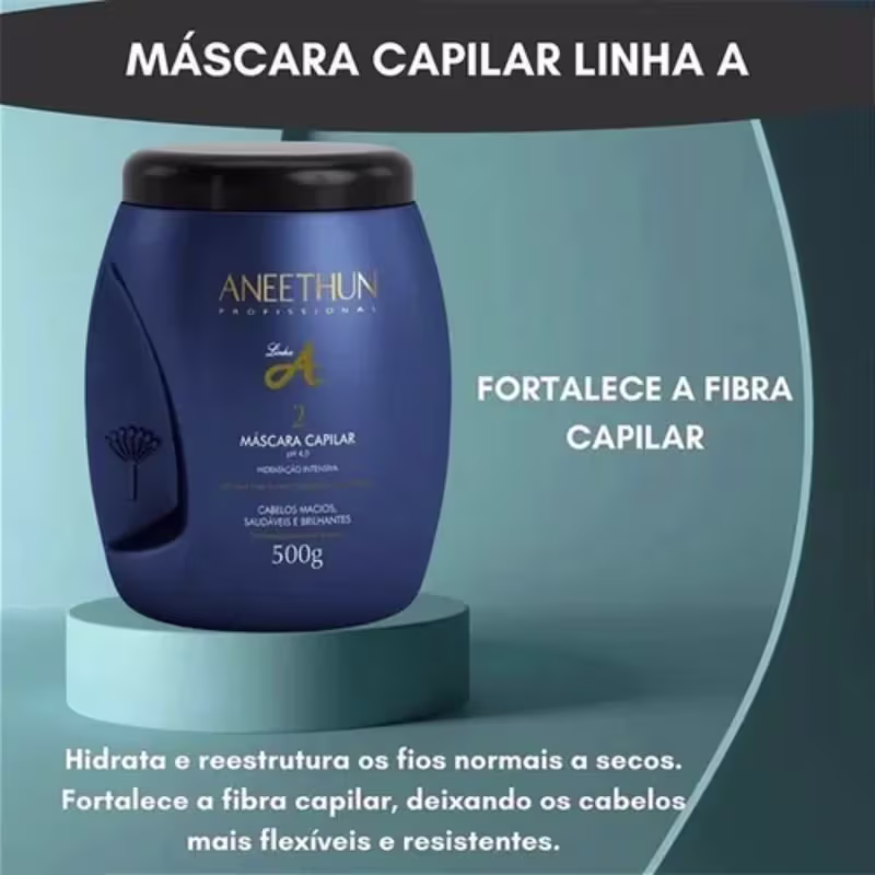 Máscara Capilar Linha A 500g: Com ativos como D-Pantenol, Colágeno e Aminoácidos, promove hidratação profunda, restaura pontas duplas e fortalece a fibra capilar, garantindo cabelos mais resistentes e com brilho duradouro.