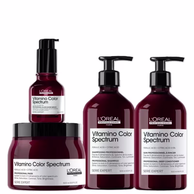 Kit com shampoo 500ml, condicionador 500ml, máscara 500ml e sérum 50ml para cabelos coloridos. L'Oréal Professionnel Vitamino Color Spectrum para Salão garante fixação intensa e proteção da cor.