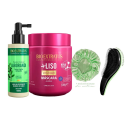 O KIT AINDA ACOMPANHA UMA TOUCA DE CETIM ANTIFRIZZ E UMA ESCOVA DESEMBARAÇADORA ANTIQUEDA DOS FIOS.