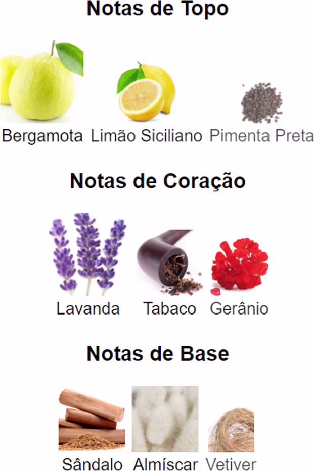 Notas de Coração: Lavanda, Tabaco e Gerânio.