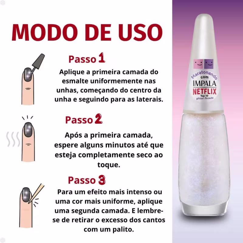 Unhas com estilo, brilho e atitude para quem ama uma boa maratona. O Esmalte Flocado Impala Netflix Maratonando Top 10 é a pedida certa para quem ama séries envolventes e um visual cheio de atitude. Com acabamento flocado e partículas reluzentes, ele proporciona um brilho multicolorido que se destaca em qualquer luz. Perfeita para acompanhar você nos momentos de relax, pipoca e maratona de séries. Com acabamento flocado e cobertura uniforme, ele oferece alta fixação, brilho duradouro e secagem rápida.