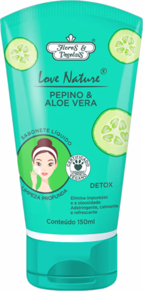 O Sabonete Líquido de Limpeza Profunda Detox Pepino e Aloe Vera da linha Love Nature ® Flores e Vegetais, elimina as impurezas e o excesso de oleosidade da pele, deixando-a limpa e renovada.
