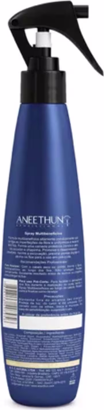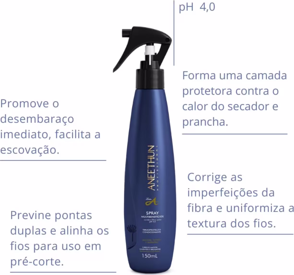 Aneethun Linha A - Spray Multifuncional 150ml: forma uma camada protetora contra o calor do secador e da chapinha. Também preserva os fios dos danos causados pelos raios UVA e UVB. Além disso, reduz o frizz, promove o desembaraço imediato, facilita a escovação e previne as pontas duplas.