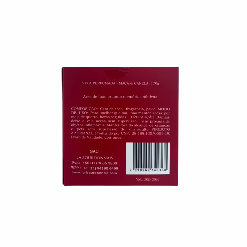 Precauções: Jamais deixe a vela acesa sem supervisão, nem próxima de objetos inflamáveis. Manter fora do alcance de crianças e pets sem supervisão de um adulto.
