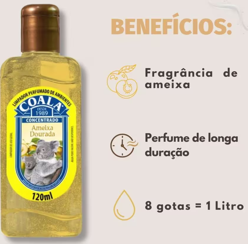 Com o Limpador Perfumado de Ambientes Coala Ameixa Dourada, você não apenas limpa, mas também transforma o ambiente, criando uma atmosfera agradável e sofisticada. Sua fórmula concentrada oferece economia e praticidade, tornando-o uma escolha inteligente para quem valoriza qualidade e bem-estar.