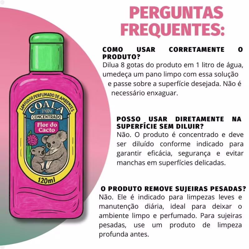 Dilua 8 gotas do Limpador Perfumado Coala - Flor de Cactos em 1 litro de água. Umedeça um pano limpo com a solução preparada. Passe sobre a superfície desejada para limpar e perfumar.