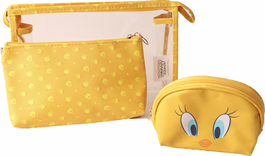 Não sei o CEPO Kit de 3 Necessaires da coleção Tweety, inspirado no Piu-Piu, é a combinação perfeita de praticidade e estilo para organizar seus itens de beleza. Com três tamanhos versáteis, ele atende a todas as necessidades do dia a dia: a maior (24,5x15x7cm) é transparente, ideal para visualizar e acessar facilmente seus produtos; a média (21x12,5cm) é compacta e perfeita para levar na bolsa; e a menor (14x10x4,5cm) é ideal para itens pequenos como acessórios ou maquiagens essenciais. Feitas com materiais de alta qualidade, elas são resistentes e fáceis de limpar, garantindo organização com muito charme.