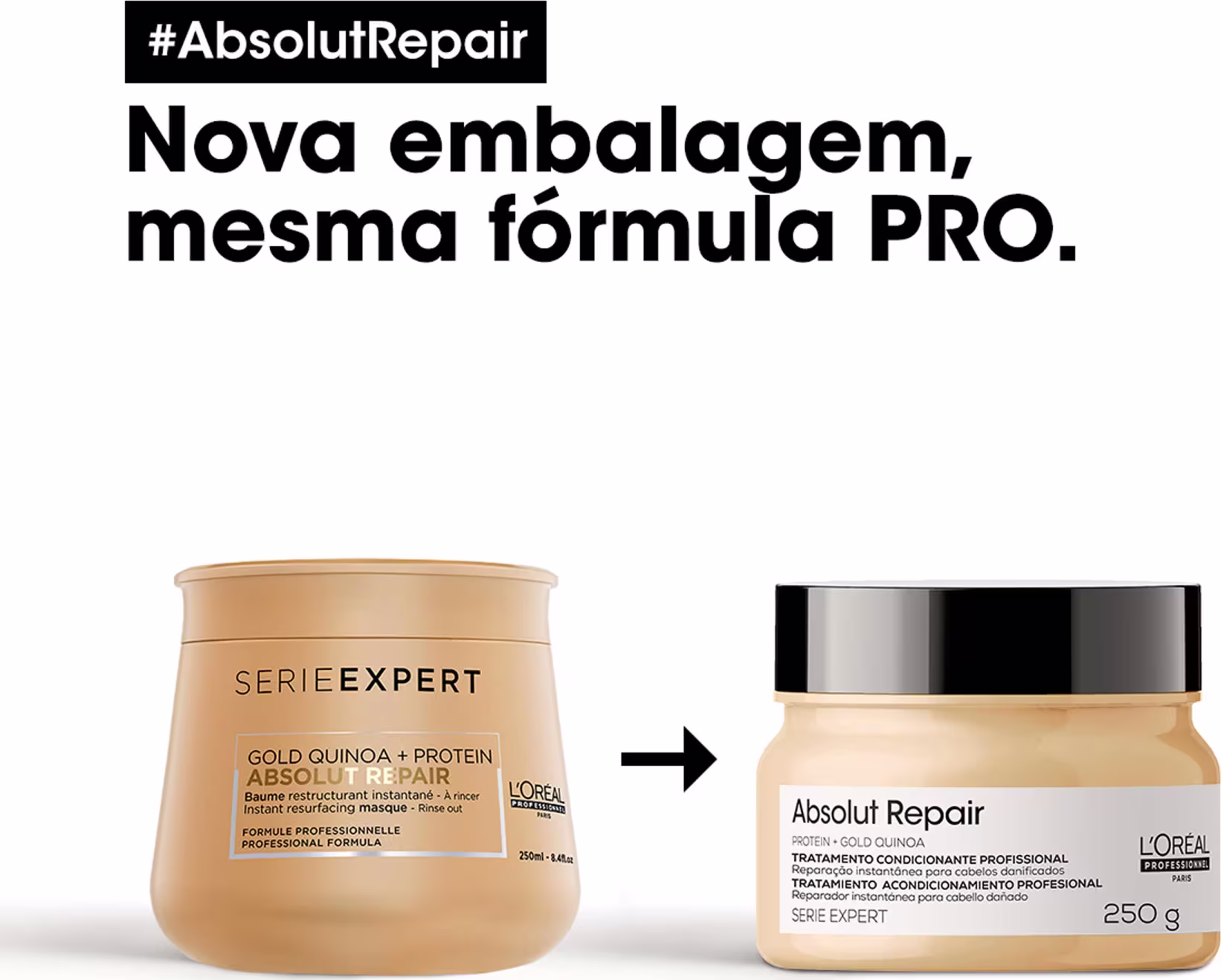 Não sei o CEPMáscara de tratamento para cabelos danificados. L'Oréal Professionnel Serie Expert Absolut Repair Gold Quinoa + Protein faz uma restauração completa nos fios para devolver saúde e brilho ao cabelo.