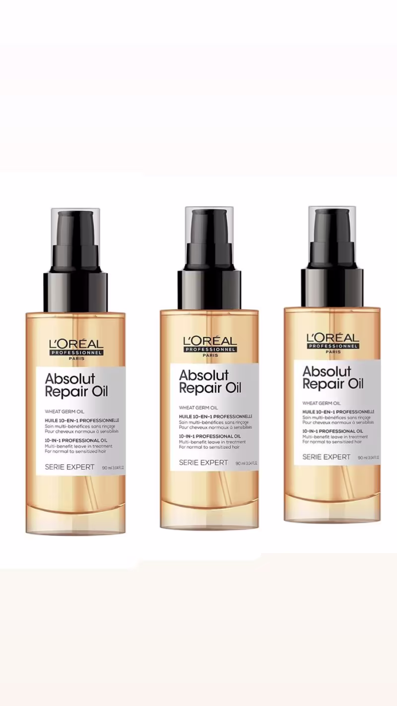 Não sei o CEPO Kit L'Oréal Professionnel Absolut Repair 10 em 1, com três unidades de 90ml, oferece tratamento intensivo para cabelos danificados. Sua fórmula, enriquecida com Quinoa Dourada e Proteína Hidrolisada de Trigo, proporciona 10 benefícios: nutrição, reparação instantânea, leveza, maciez, desembaraço, condicionamento, maleabilidade, brilho, proteção da fibra e ação calmante. Com tecnologia de co-emulsão, penetra profundamente na fibra capilar, promovendo resultados eficazes sem pesar os fios. Ideal para uso profissional ou doméstico, garante cabelos saudáveis, brilhantes e protegidos contra agressões externas.