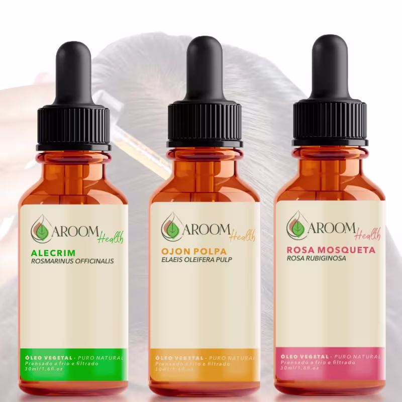 Descubra o Kit de óleos vegetais 100% puro natural de Alecrim, Ojon polpa e Rosa Mosqueta rubiginosa , uma combinação perfeita para cuidar do seu cabelo e pele de forma natural e eficaz , ideal para quem busca hidratacão, nutrição e regeneração.