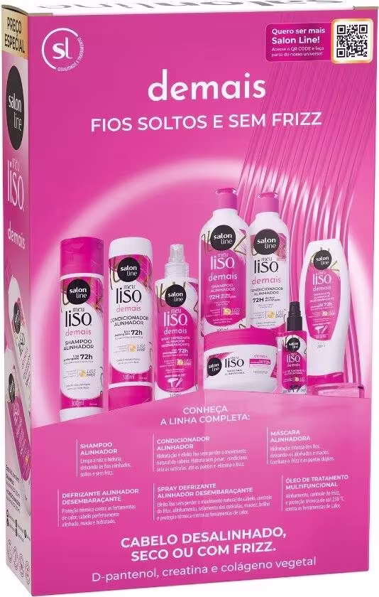 O kit contém 1 Shampoo Meu Liso Demais 300ml, 1 Condicionador Meu Liso Demais 200ml, 1 Máscara Hidratante Meu Liso Demais 300g e 1 Rímel Alinhador Antifrizz Meu Liso Demais 8g, a combinação perfeita para proporcionar limpeza eficaz, hidratação profunda e controle eficaz do frizz.