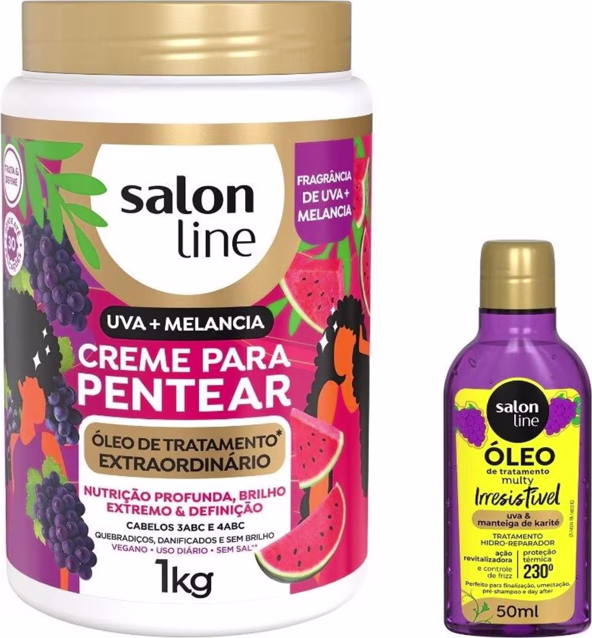 O kit contém 1 Kit Creme para Pentear Uva + Melancia 1kg e 1 Óleo de Tratamento Multy Uva 50ml, a combinação ideal para oferecer nutrição profunda, brilho intenso e definição aos cabelos danificados, desnutridos e sem vida.