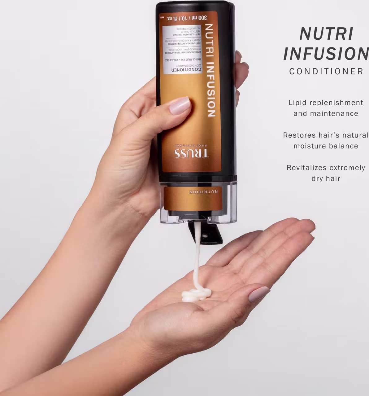 Truss Nutri Infusion - Condicionador 300ml: proporciona fácil desembaraço e hidratação prolongada. Fortalece a fibra capilar, sela cutículas e deixa os fios leves, soltos e com toque sedoso desde a primeira aplicação.