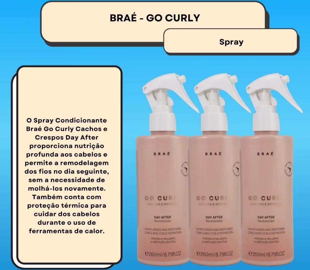 Contém:03 Unidades Braé Go Curly Cachos e Crespos Day After Spray Condicionante 260ml