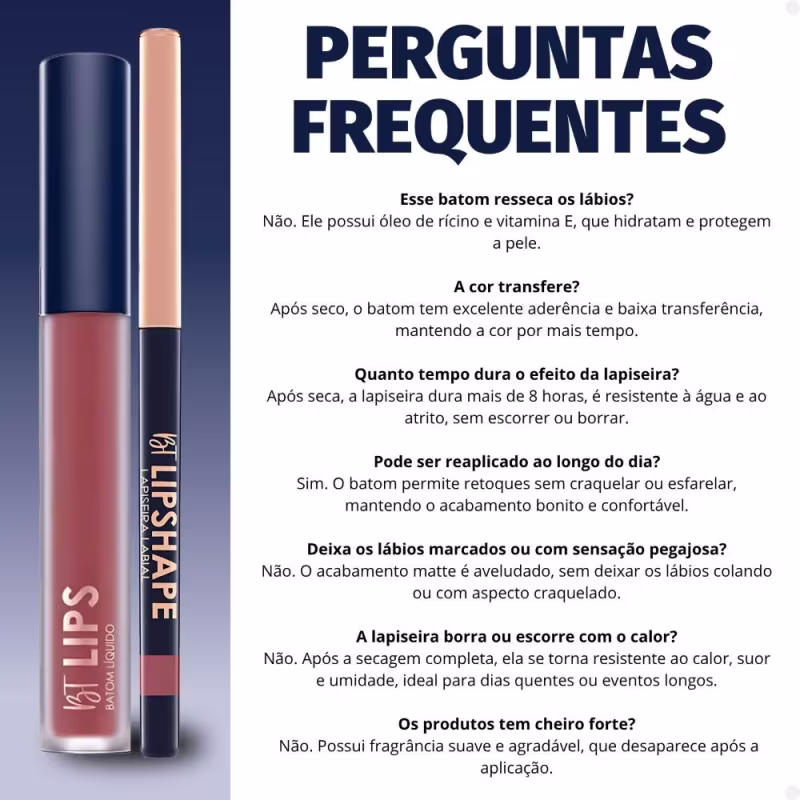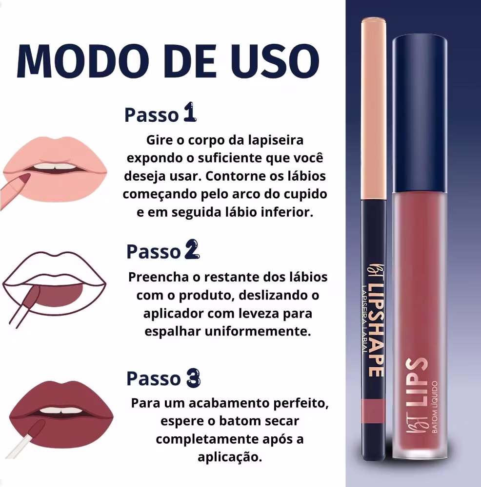 Batom:Preencha os lábios com o produto, deslizando o aplicador com leveza para espalhar uniformemente. Para um acabamento perfeito, espere o batom secar completamente após a aplicação.