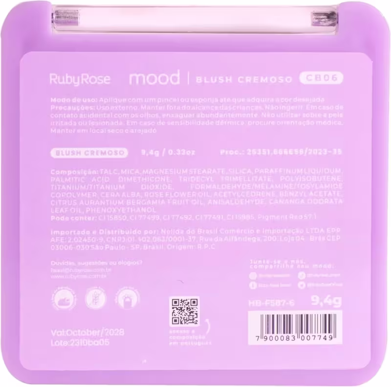O Blush Compacto Mood Ruby Rose conta com alta pigmentação. Possui componentes que proporcionam alta fixação na pele, sua textura é fina e aveludada, possui ótima durabilidade. Com ele, o rosto fica corado e harmônico. É perfeito para dar aquela corzinha nas bochechas e ainda levar na bolsa para retocar o look a qualquer momento, pois sua embalagem é prática e compacta. São 4 cores diferentes para você se divertir. -Alta Pigmentação -Textura fina aveludada -Durabilidade e fixação Modo de Usar Aplique com um pincel ou esponja até que adquira a cor desejada. Precauções Uso externo. Manter fora do alcance das crianças. Não ingerir. Em caso de contato acidental com os olhos, enxaguar abundantemente. Não utilizar sobre a pele irritada ou lesionada. Em caso de sensibilidade dérmica, procure orientação médica. Manter em local freco e arejado.