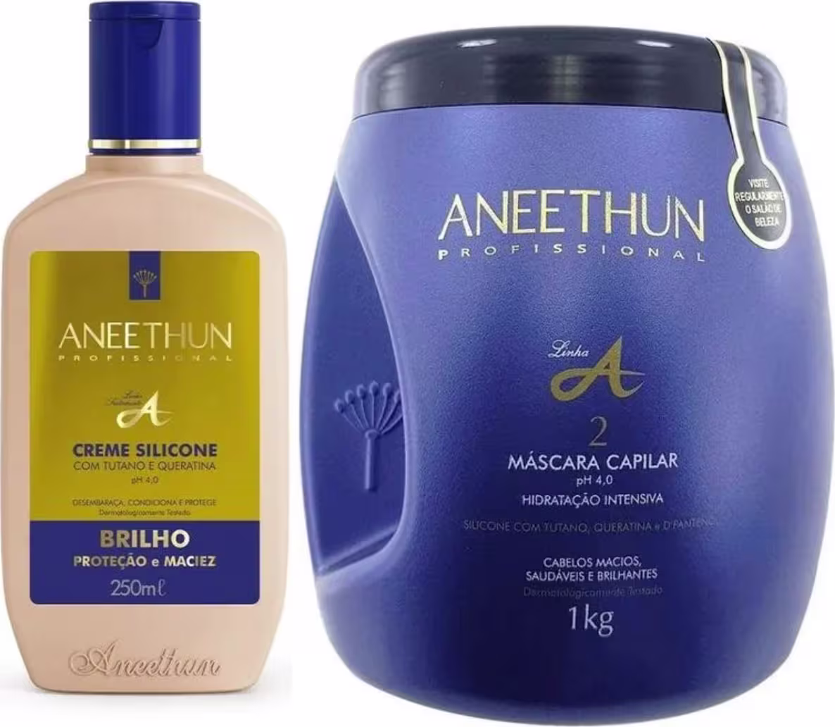 O Kit Aneethun Linha A Creme Mask Duo é uma verdadeira fonte de hidratação, maciez e luminosidade para os fios! Enriquecido com ingredientes poderosos como tutano, silicone, D'Pantenol, queratina, colágeno e aminoácidos, oferece nutrição, fortalecimento, proteção contra danos externos e reconstrução profunda, deixando os cabelos brilhantes, sedosos e mais resistentes.