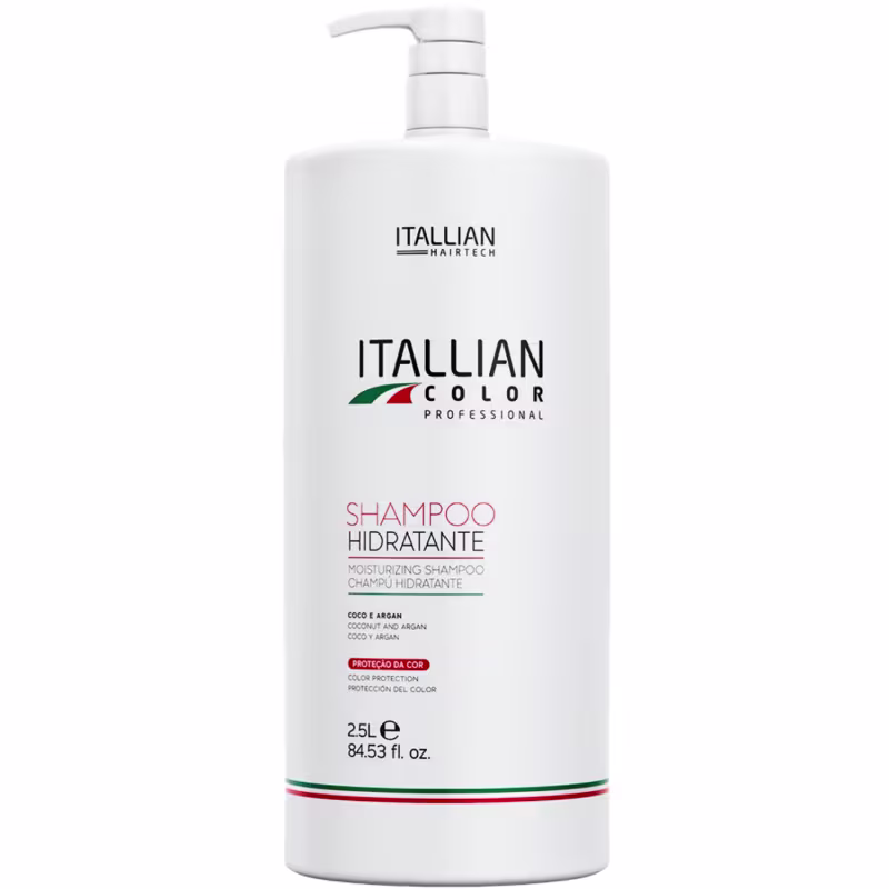 Shampoo Hidratante Itallian Color de 2.5 litros para lavatórios, rende mais de 180 aplicações. Proporciona a limpeza e a hidratação dos fios. Além disso, promove emoliência, força, brilho e movimento aos cabelos. Oferece tecnologia exclusiva de proteção da cor a partir de um componente 100% vegetal com cera de arroz, ésteres de jojoba e óleo de girassol que garantem uma cor mais intensa e duradora. A concentração dessas substâncias protege os fios contra o ressecamento, promove nutrição avançada das camadas mais profundas da fibra capilar e atua no controle do frizz.