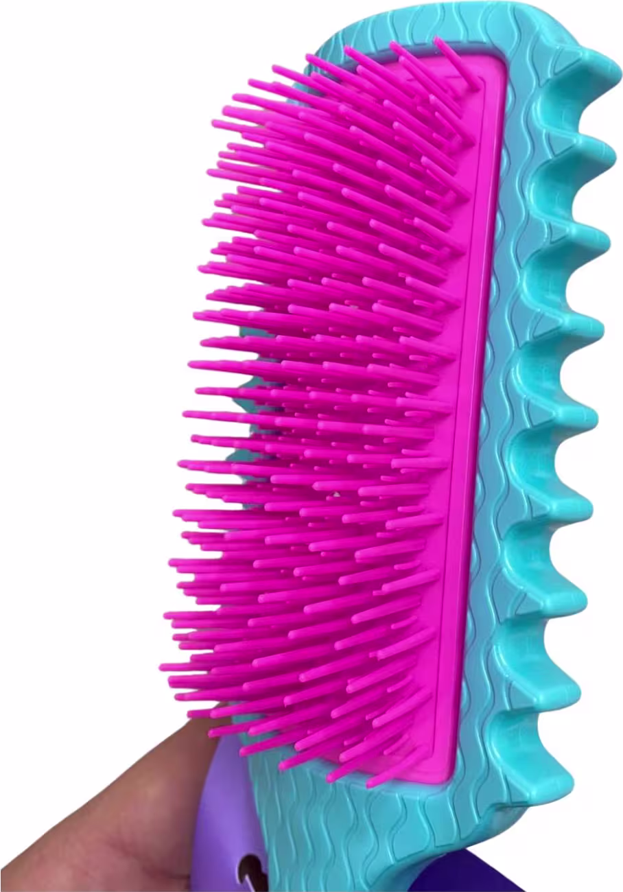 Escova de cabelo para definir e finalizar cabelos cacheados. Sua Estrutura possui fendas laterais que conduzem as mechas do cabelo para uma fitagem mais definida e eficiente. Cerdas flexíveis e macias que desembaraçam e não quebram os fios.