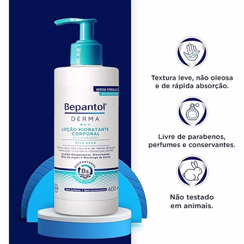 A Loção Hidratante Corporal Bepantol Derma em tamanho maior é especialmente desenvolvida para promover hidratação profunda, restaurar a barreira protetora da pele e oferecer maciez prolongada. Ideal para uso diário em todo o corpo, seu formato em 400 ml garante rendimento extra com a mesma eficácia.