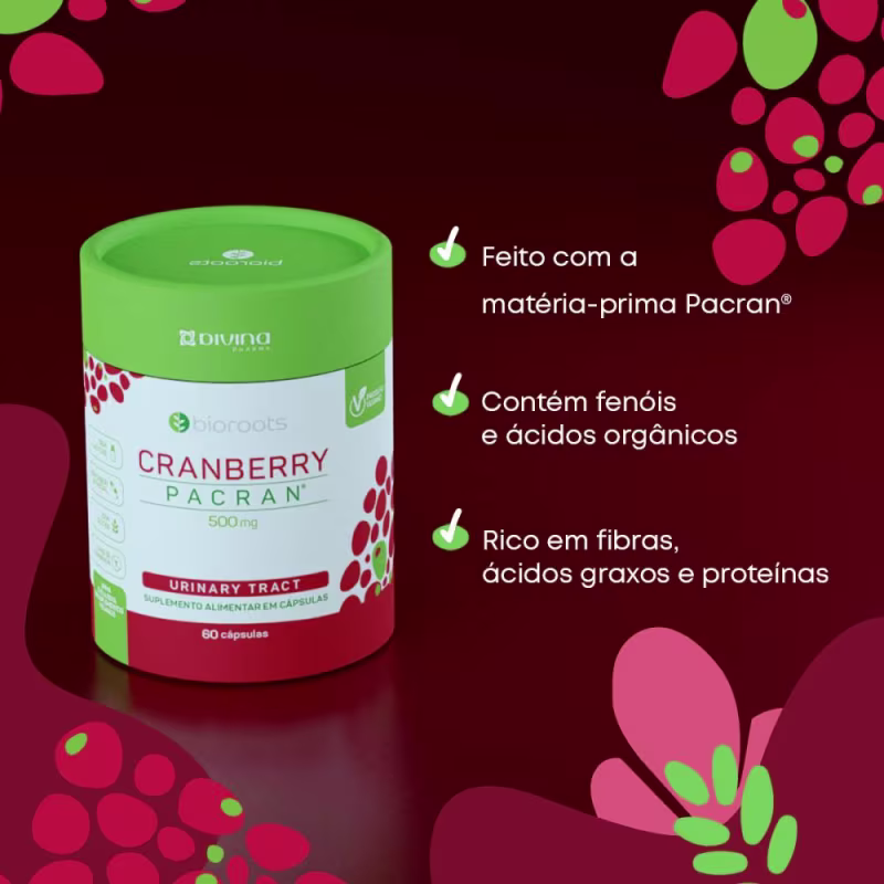 Não sei o CEPA Cranberry Pacran® 500mg da Bioroots é uma fonte natural de saúde para o seu bem-estar diário. Formulado com a matéria-prima Pacran®, nosso suplemento oferece suporte para a saúde do trato urinário. Além de uma fórmula limpa, também é vegano, livre de glúten e transgênicos.
