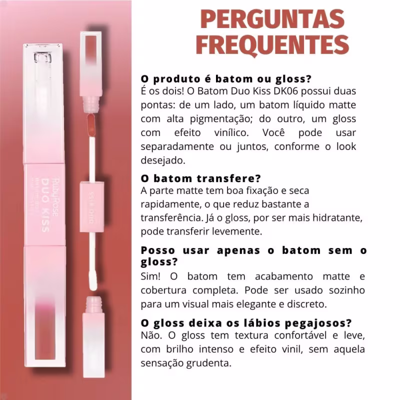 Duas experiências em um só produto: cor matte intensa e brilho vinílico com conforto absoluto! Descubra o poder da praticidade com o Batom Duo Kiss Ruby Rose DK06. Um item de maquiagem multifuncional que une o melhor dos dois mundos: de um lado, um batom líquido com acabamento matte aveludado e alta pigmentação; do outro, um gloss com efeito vinílico que adiciona brilho e dimensão aos lábios sem sensação pegajosa. Com design inteligente de dupla ponta, ele é perfeito para quem busca praticidade, performance e um visual sofisticado em qualquer ocasião. Use o batom sozinho para um look mais clássico e elegante, aplique o gloss para um toque de luminosidade ou combine os dois para criar lábios volumosos e irresistíveis com efeito espelhado. O tom DK06 é um nude rosado delicado e elegante, perfeito para criar desde makes naturais e românticas até composições mais glamourosas. Sua fórmula confortável, aliada à alta durabilidade e fácil aplicação, garante um acabamento impecável do início ao fim do dia.