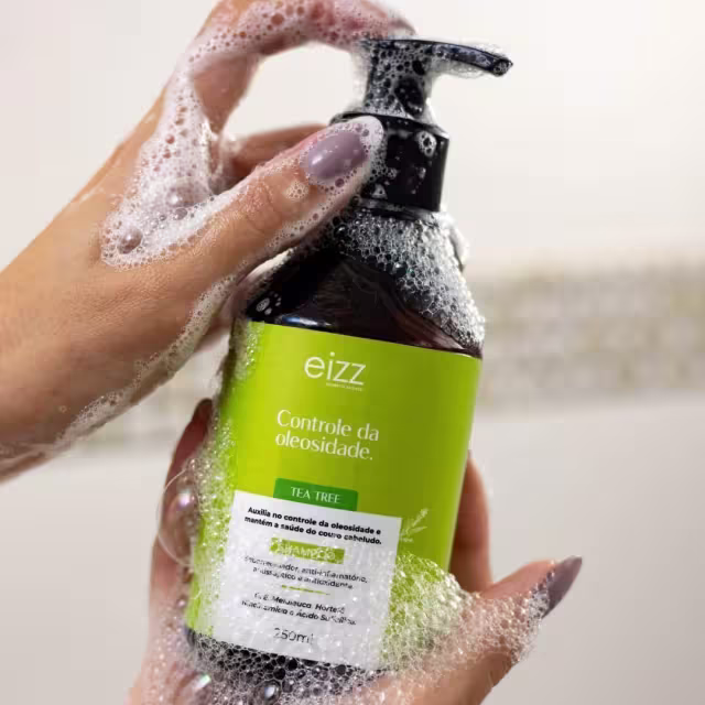 O Shampoo Controle de Oleosidade Tea Tree Equilibrium Eizz é indicado para couro cabeludo misto e oleoso, ajudando a controlar a oleosidade excessiva e a manter o equilíbrio e a integridade do manto hidrolipídico. Proporciona couro cabeludo limpo e fios macios, sedosos e com brilho. Sua fórmula contém Óleo Essencial de Melaleuca, Nano Cooper, Niacinamida, Ácido Salicílico, Calêndula, Hamamélis, Hortelã, Aloe Vera e Camomila, ativos que possuem ação anti-inflamatória, antimicrobiana, seborreguladora, calmante e cicatrizante, contribuindo para a saúde do couro cabeludo e fortalecimento dos fios. Modo de uso: Umedeça o couro cabeludo, aplique o shampoo massageando com movimentos circulares e deixe agir por 3 minutos. Enxágue bem e repita se necessário, sem precisar pausar na segunda aplicação.