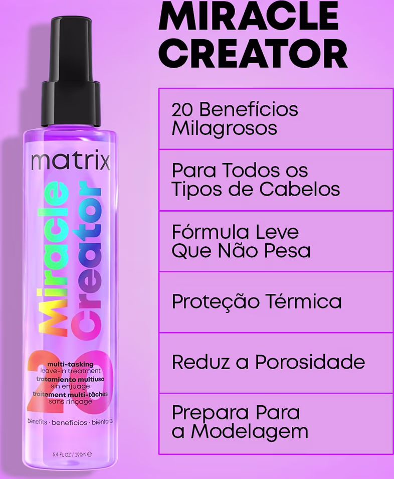 Matrix Miracle Creator - Leave-in Multifuncional Spray 190ml: finalizador multifuncional que oferece 20 benefícios em uma só aplicação. Protege do calor, disciplina o frizz, melhora a resistência capilar e entrega nutrição intensa, brilho duradouro e toque suave.