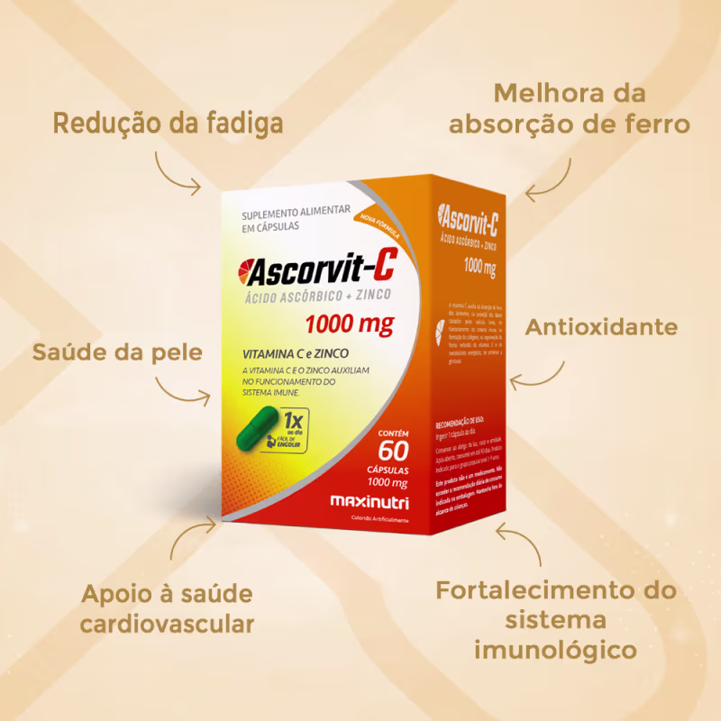 Cada cápsula do Ascorvit-C fornece uma alta dose de vitamina C e zinco, podendo auxiliar na formação do colágeno, auxilia na regeneração da forma reduzida da vitamina E, auxilia no metabolismo energético, auxilia no metabolismo de proteínas e gorduras.