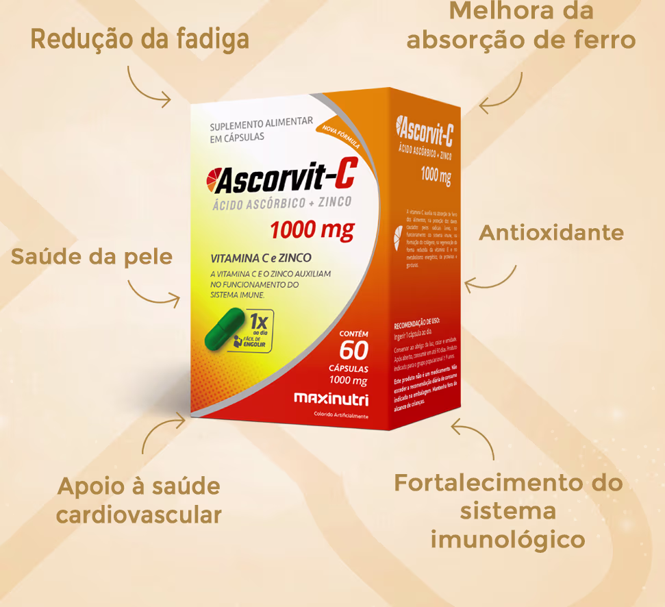 Cada cápsula do Ascorvit-C fornece uma alta dose de vitamina C e zinco, podendo auxiliar na formação do colágeno, auxilia na regeneração da forma reduzida da vitamina E, auxilia no metabolismo energético, auxilia no metabolismo de proteínas e gorduras.