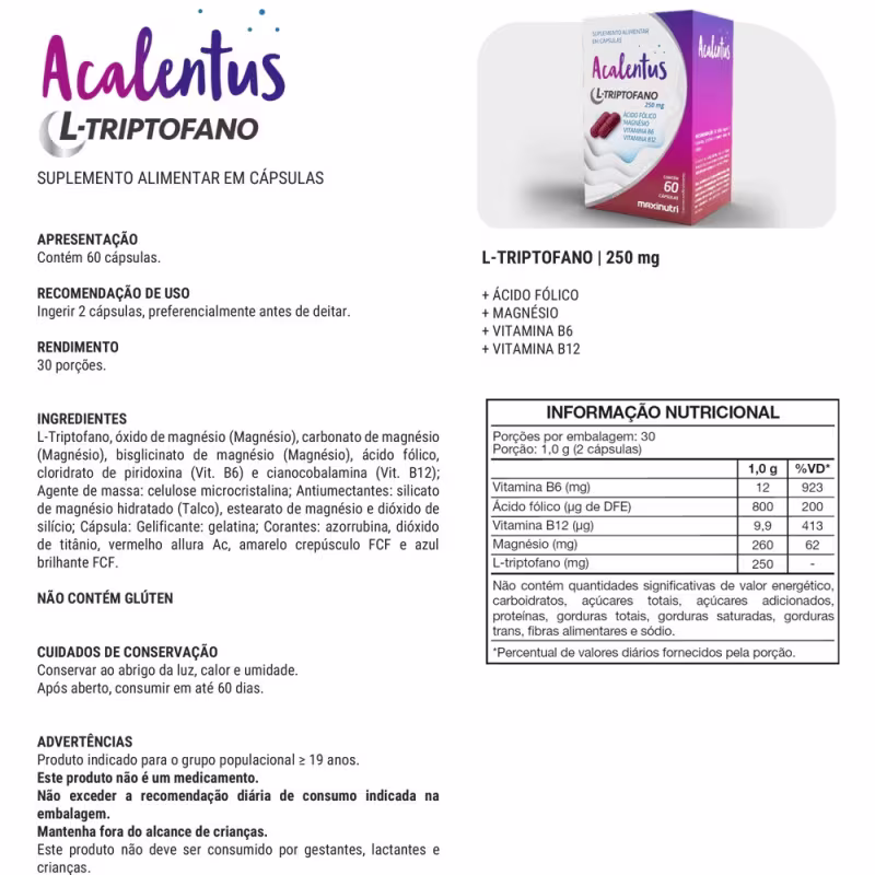 Acalentus L-triptofano 250mg B12 60 Cápsulas Maxinutri