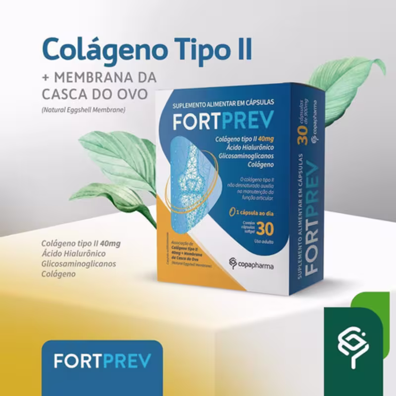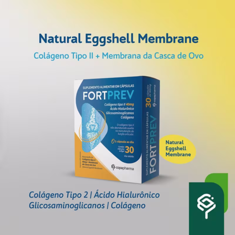 Fortprev da Copapharma associa o Colágeno tipo II com a Membrana da Casca do Ovo sendo um importante aliado para a saúde das articulações. A Membrana da Casca do Ovo, também conhecido como Natural Eggshell Membrane, como suplemento alimentar é classificada como substância bioativa fonte de ácido hialurônico, de colágeno e de glicosaminoglicanos.