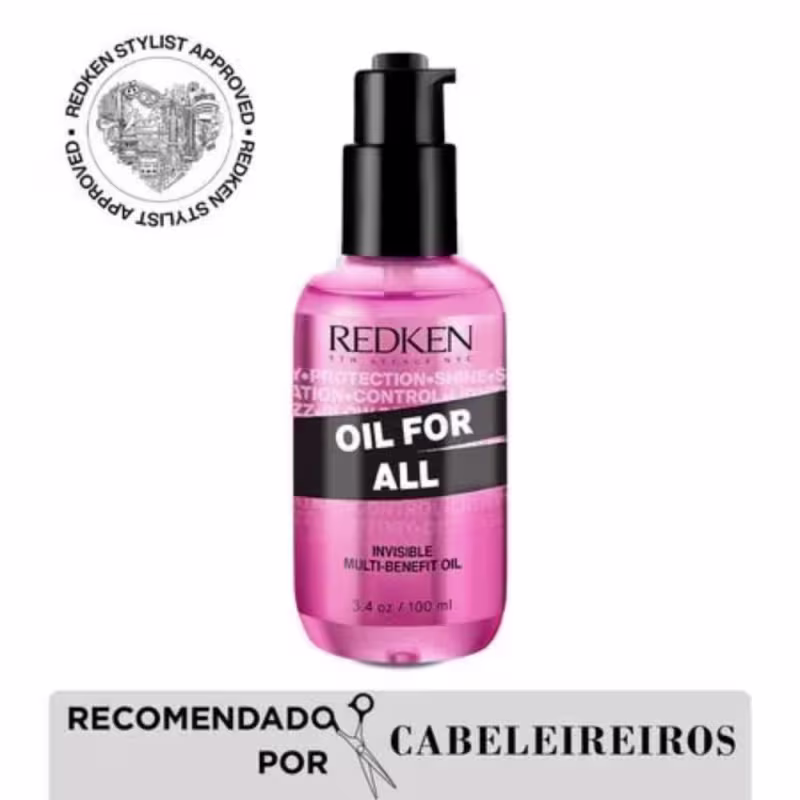 Óleo capilar para todos os tipos de cabelo. Redken Oil For All adiciona brilho instantâneo, suaviza os fios e combate o frizz.